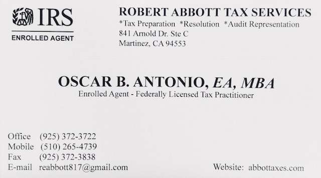 As with wealth...So with Taxes It is how much you save that counts, not how much you make. Robert Abbot tax Services is a full service Tax Preparation firm of long standing in the City of Martinez, California, USA. We service all kinds of Tax needs, from individual and business income Tax preparation, IRS Issues Resolution to Audit Representation. We got you covered. Our client base starts with the grandparents, to the moms and dads, and then the grandchildren. We watch our client families grow, and as they grow, so do we.