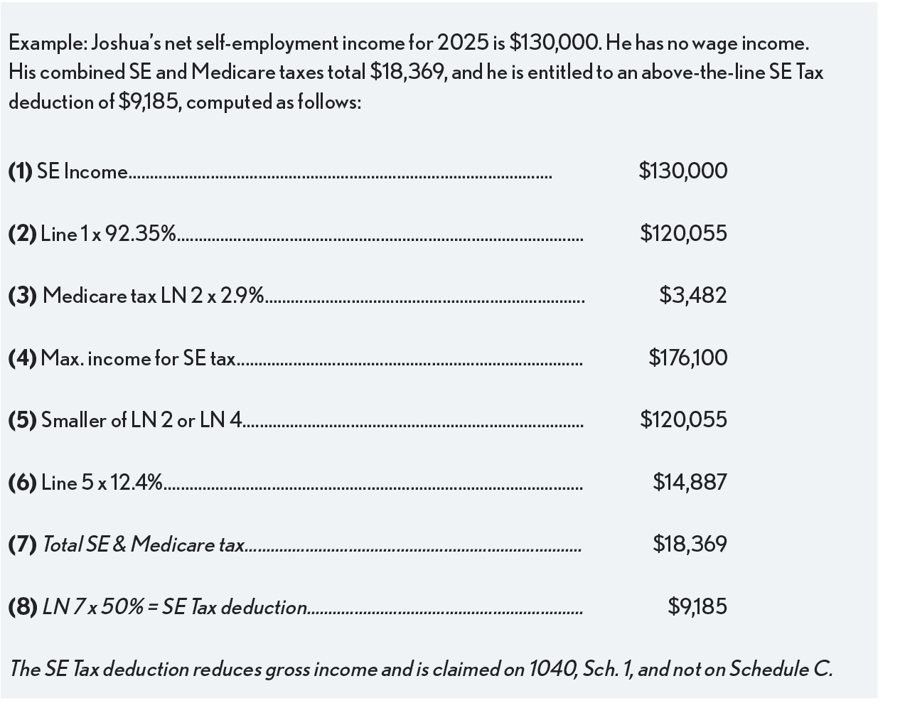 A taxpayer can deduct one-half of the SE tax computed on Schedule SE for the year as a business expense that is deducted as an adjustment to gross income on Form 1040, Schedule 1, part II (line 15 of the 2021 form). This deduction has no effect on the computation of net SE income or on the computation of SE tax.